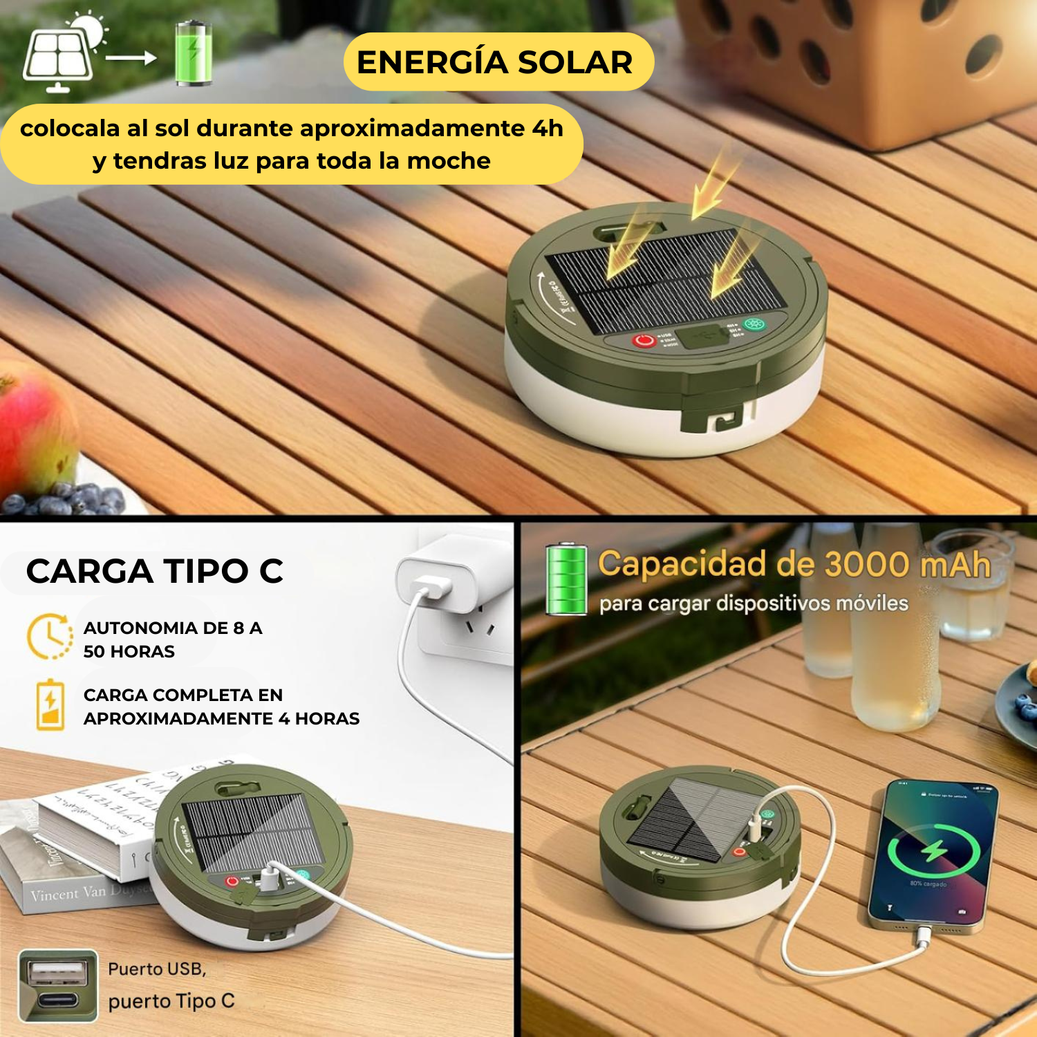 Su panel solar integrado se carga durante el día y ofrece horas de luz cálida y envolvente por la noche, sin necesidad de cables ni enchufes. además de poder cargar dispositivos como los móviles